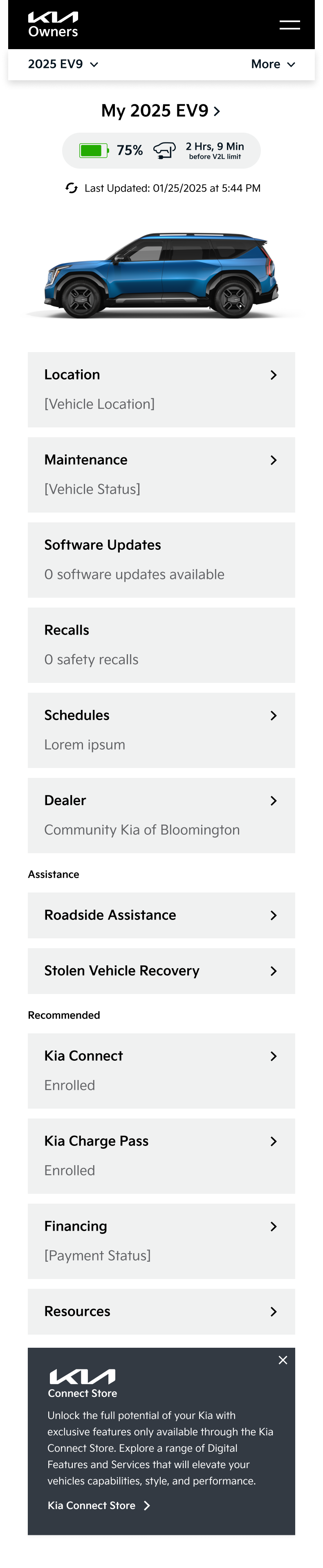The post-login experience was more dashboard-focused, requiring us to deviate from the “reuse established kia.com components” approach and propose new concepts, looking to highly regarded tech-froward OEMs like Tesla and Rivian for inspiration. There were a lot of small experience and logic improvements that needed to be made which we addressed while breaking down, pulling apart, and putting back together the features of the experience.