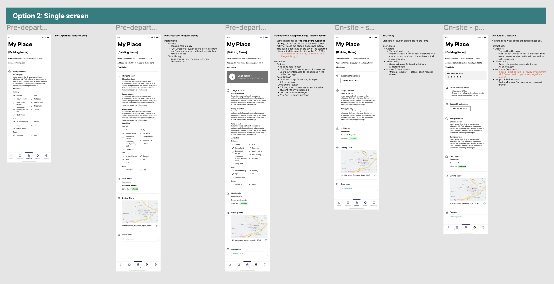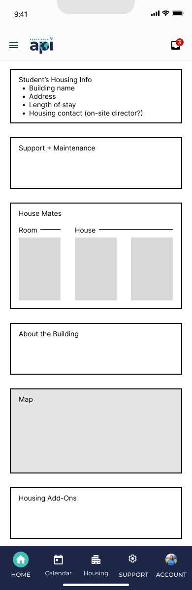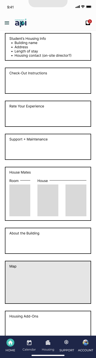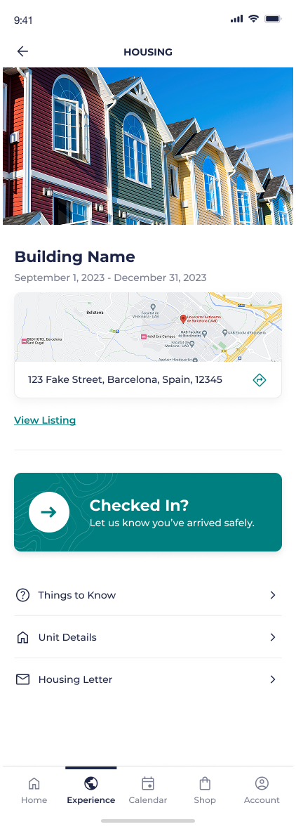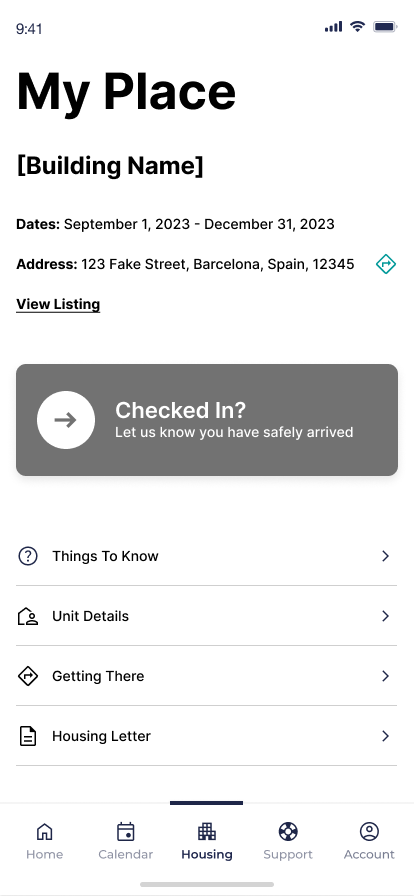 Housing is another area where student needs will vary, but to less extreme lengths than the needs of the “Home” experience. The “Housing” states reflect smaller, but still important, content need: knowing what to pack to bring on your trip before you leave, reporting maintenance and roommate issues while living in your new housing, and knowing how to check out before you leave to return home.