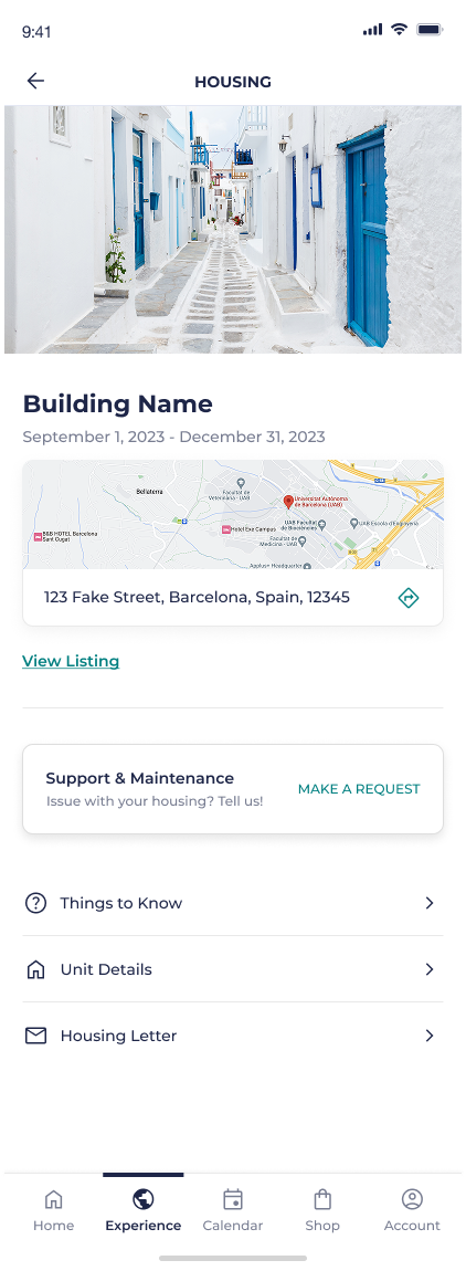 After: We turned City Guides into an interactive in-app experience, modeled after well-established patterns like Google Maps saved location lists. This allows students to see what’s near their current location, have permanent pins to places like their housing and university, and get directions through their native map app to any location in the city guide.