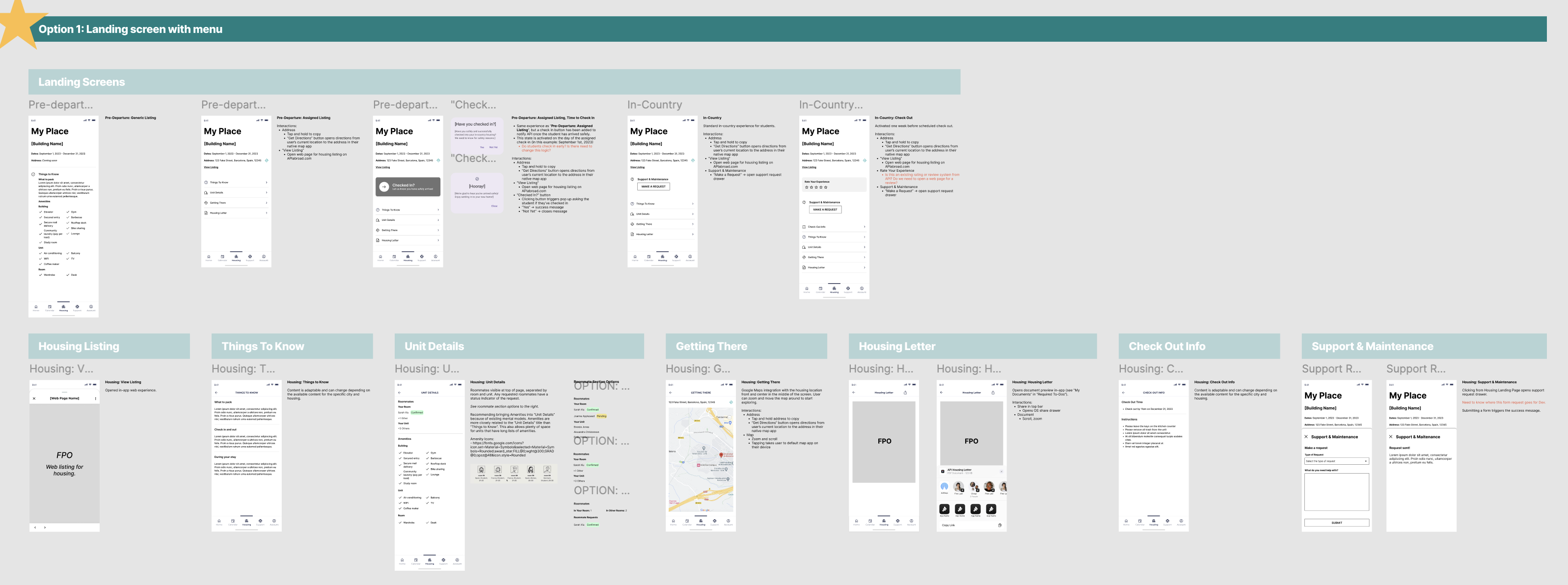End of Project: as each section got designed out, we’d replace the wires with the designs in the app map. We referenced this page so much more than I expected. It became a tool for checking design patterns and consistencies, prototyping, explaining states and intra-app connections, and allowed us to easily share a view of the completed work with the client and colleagues within our agency.