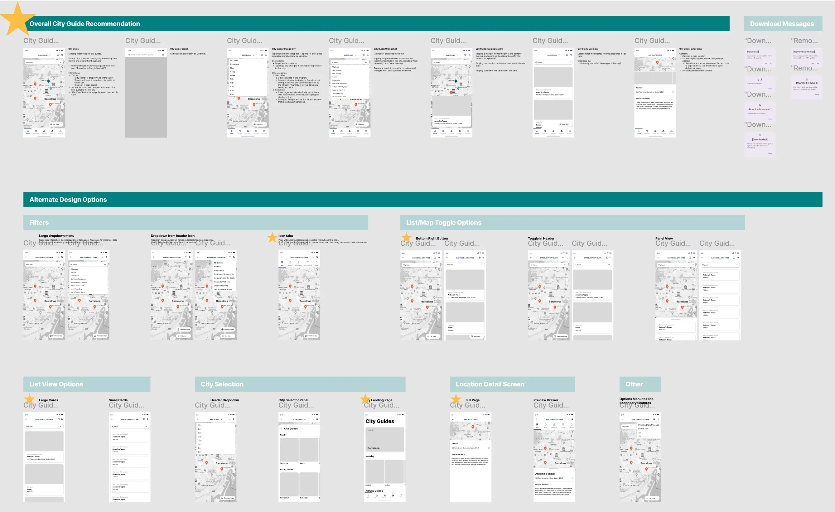 City Guides: wireframe concept explorations and overall recommendation.